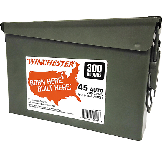 Winchester USA White Box stands for consistent performance and outstanding value offering high-quality ammunition to suit a wide range of hunter’s and shooter’s needs. This item comes 300 rounds per can and 2 cans per case. – Caliber: 45 Automatic Colt Pistol – Bullet Type: Full Metal Jacket – Bullet Weight: 230 gr – Muzzle Energy: 356 ft / lbs – Muzzle Velocity: 875 fps – Rounds Per Box: 300