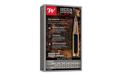 Deer Season XP ammunition combines Winchester’s extensive experience into a product engineered specifically for deer hunters. The Extreme Point bullet features an oversized impact diameter. A bigger impact diameter means more impact trauma, better energy transfer and faster knockdown.
